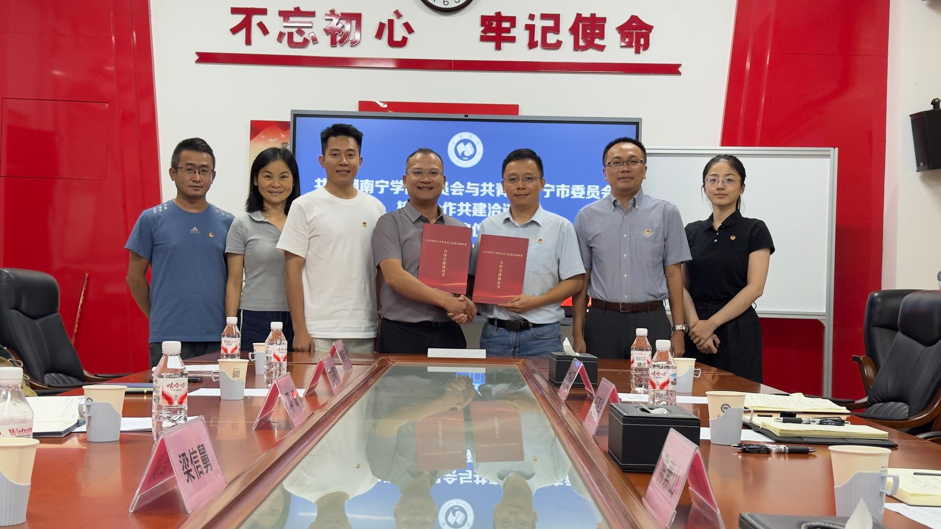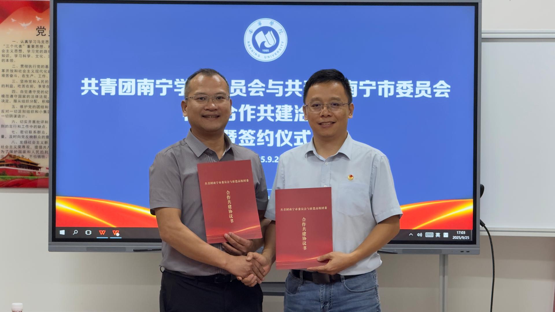 9月25日,我校与共青团南宁市委员会在南宁学院举行校地合作共建洽谈会暨签约仪式,共同探索共青团组织与高校协同育人新路径。共青团南宁市委员会副书记李基华、我校团委书记邓斌等出席活动并签署合作协议。