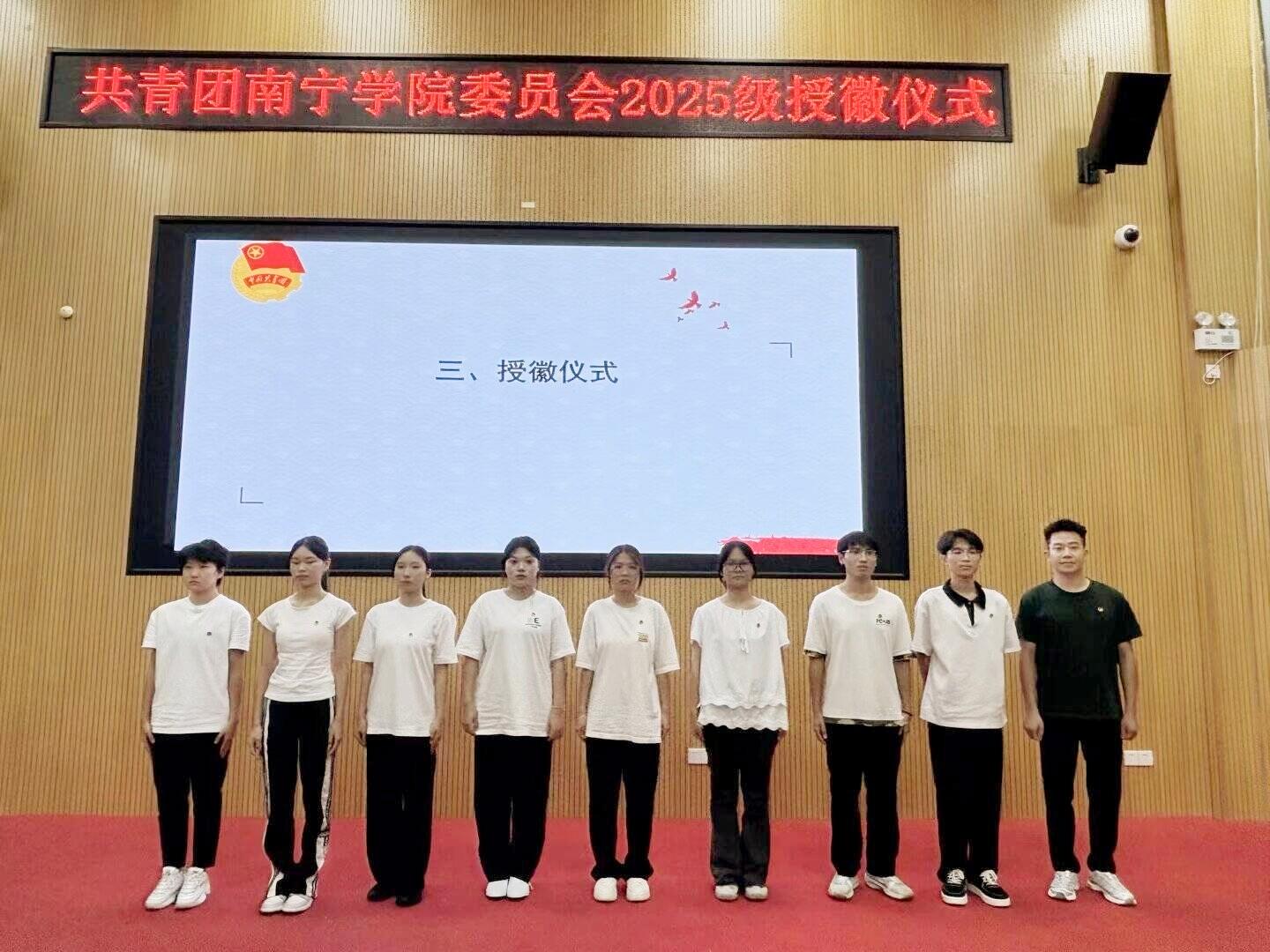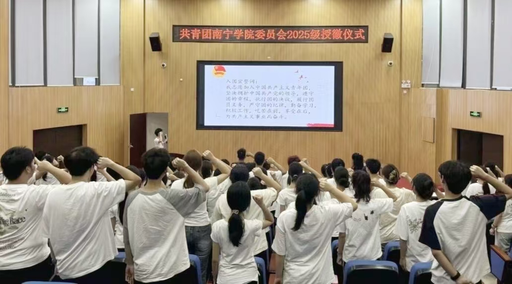 10月17日19:00,敷文园A108团旗高悬、团歌嘹亮,共青团南宁学院委员会在此举行2025级新生团干授徽仪式。校团委尤兆智老师与全体校团委学生团干共同见证“新生团干”接过团徽、许下青春誓言的庄严时刻。