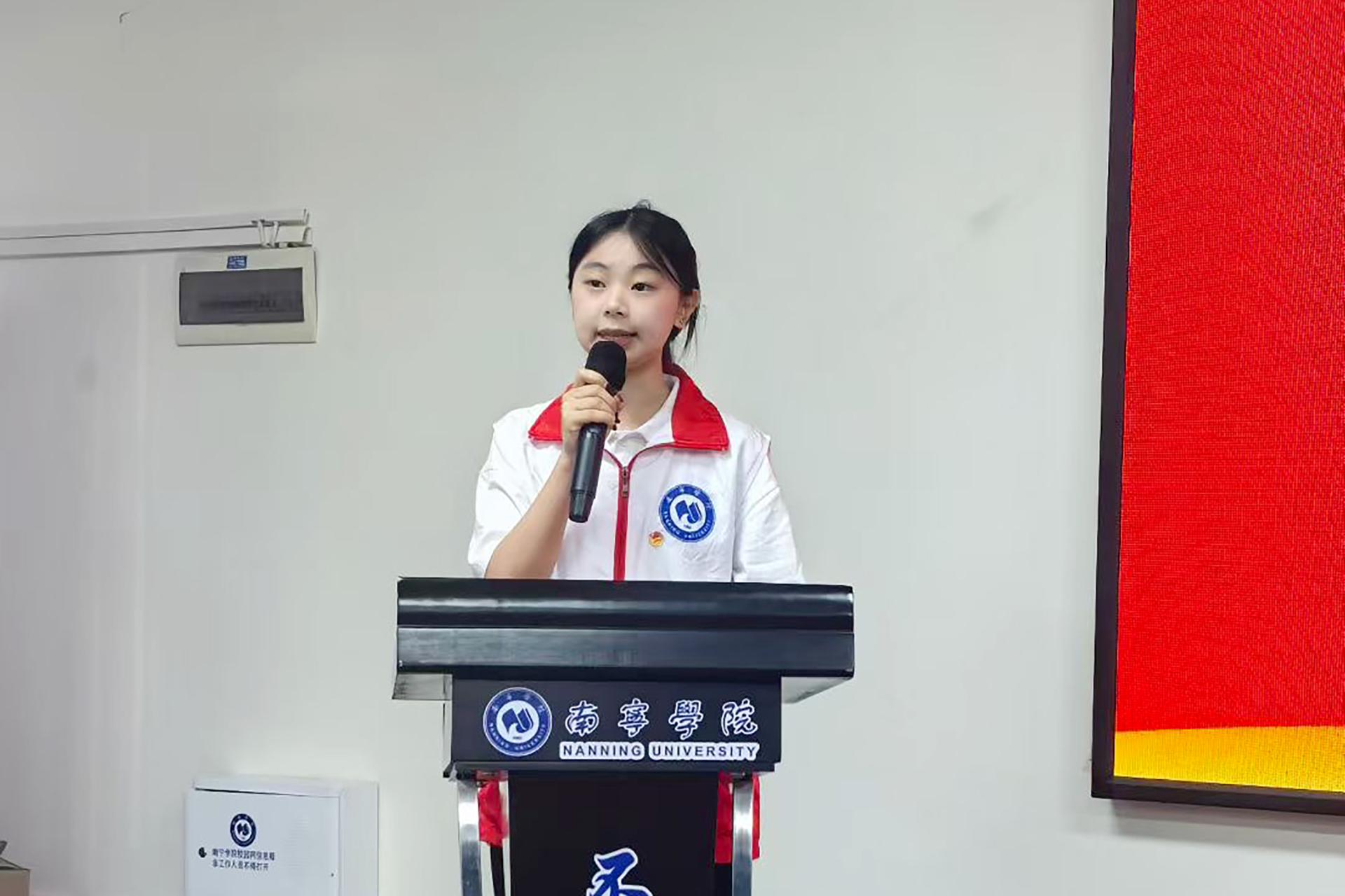 随后,志愿者代表谢鑫同学发言。她分享了此次暑期“三下乡”社会实践活动的筹备情况、个人感悟以及未来工作的具体规划,讲述了对即将开始的实践之旅的期待与憧憬,号召全体志愿者以专业所学服务基层,展现新时代青年的责任与担当。