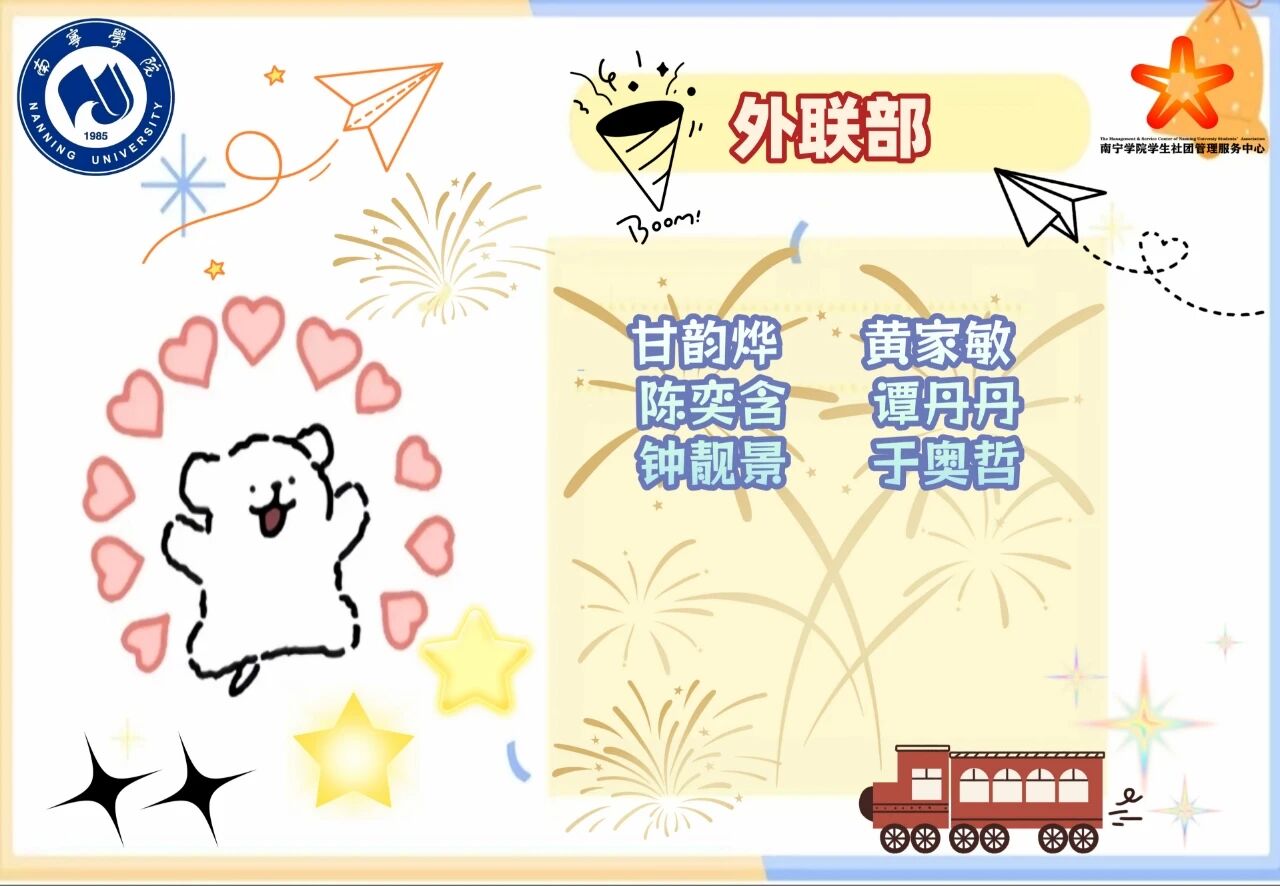 外联部:甘韵烨、陈奕含、钟靓景、黄家敏、谭丹丹、于奥哲