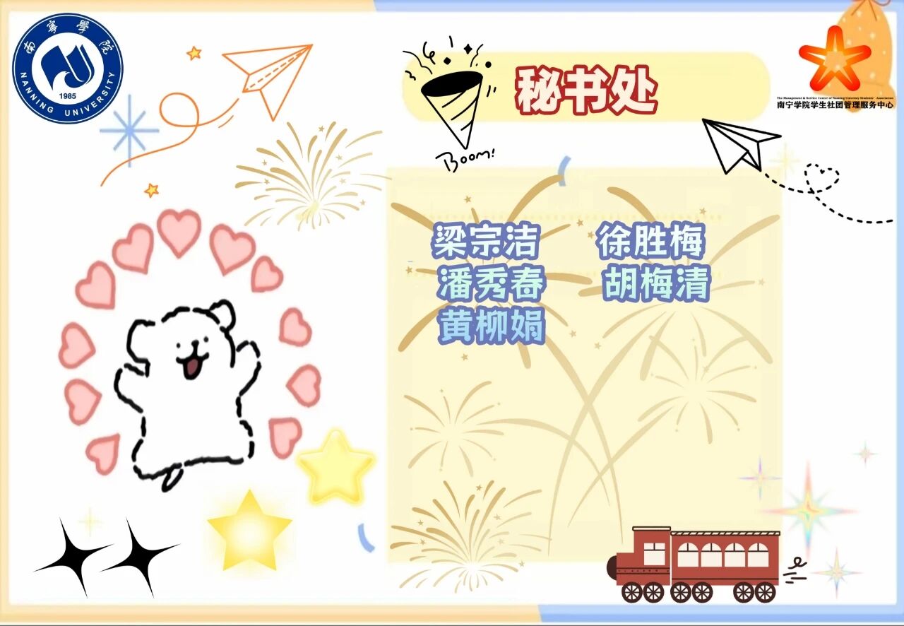 秘书处:梁宗洁、徐胜梅、潘秀春、胡梅清、黄柳娟