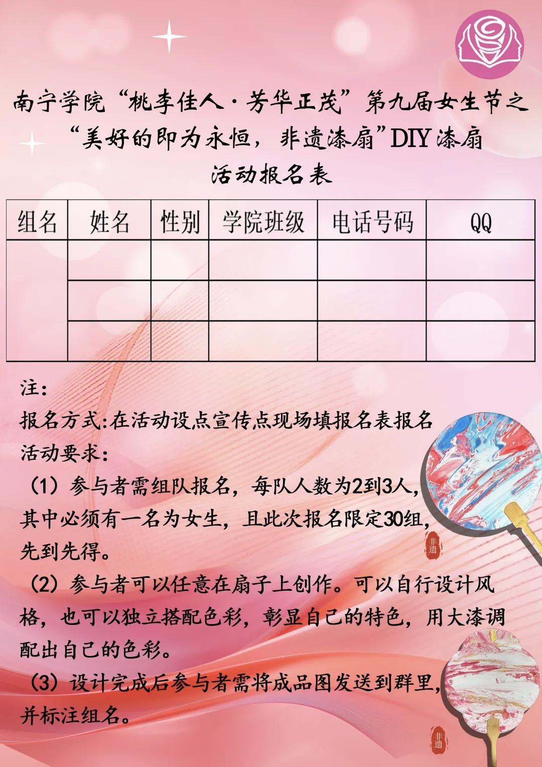 漆扇是我国的非物质文化遗产,在女生节之际,我们将漆扇与女生节相结合,希望通过DIY漆扇的活动,让同学们开动脑筋,活跃思维能力。