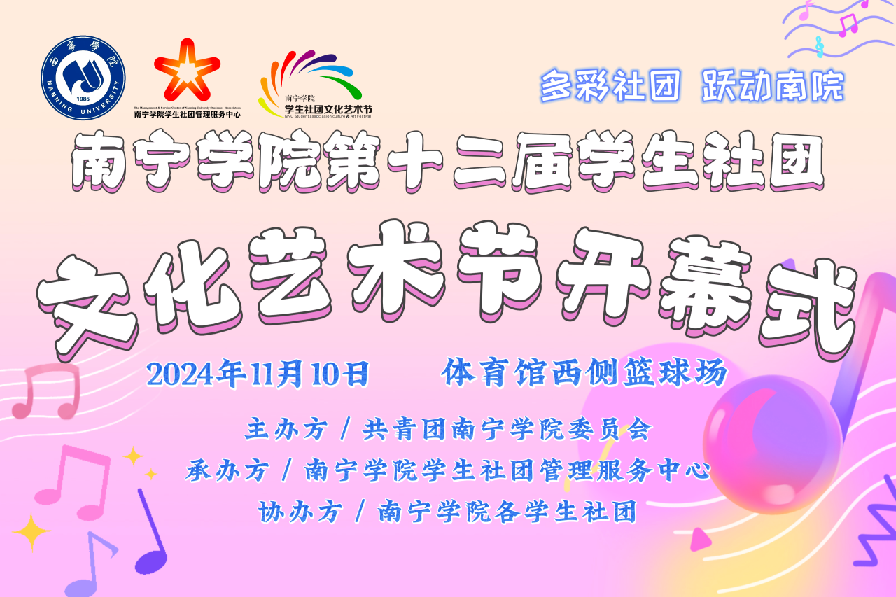 随着秋意渐浓,丰收的季节也悄然而至,又到了南宁学院一年一度学生社团文化艺术节。为了增添校园文化的多彩氛围,增进社团间的互动与合作,以及推动社团的进一步发展,南宁学院学生社团管理服务中心定于2024年11月10日早上9点,在校园内体育馆西侧篮球场隆重举行“多彩社团,跃动南院”南宁学院第十二届学生社团文化艺术节开幕仪式!