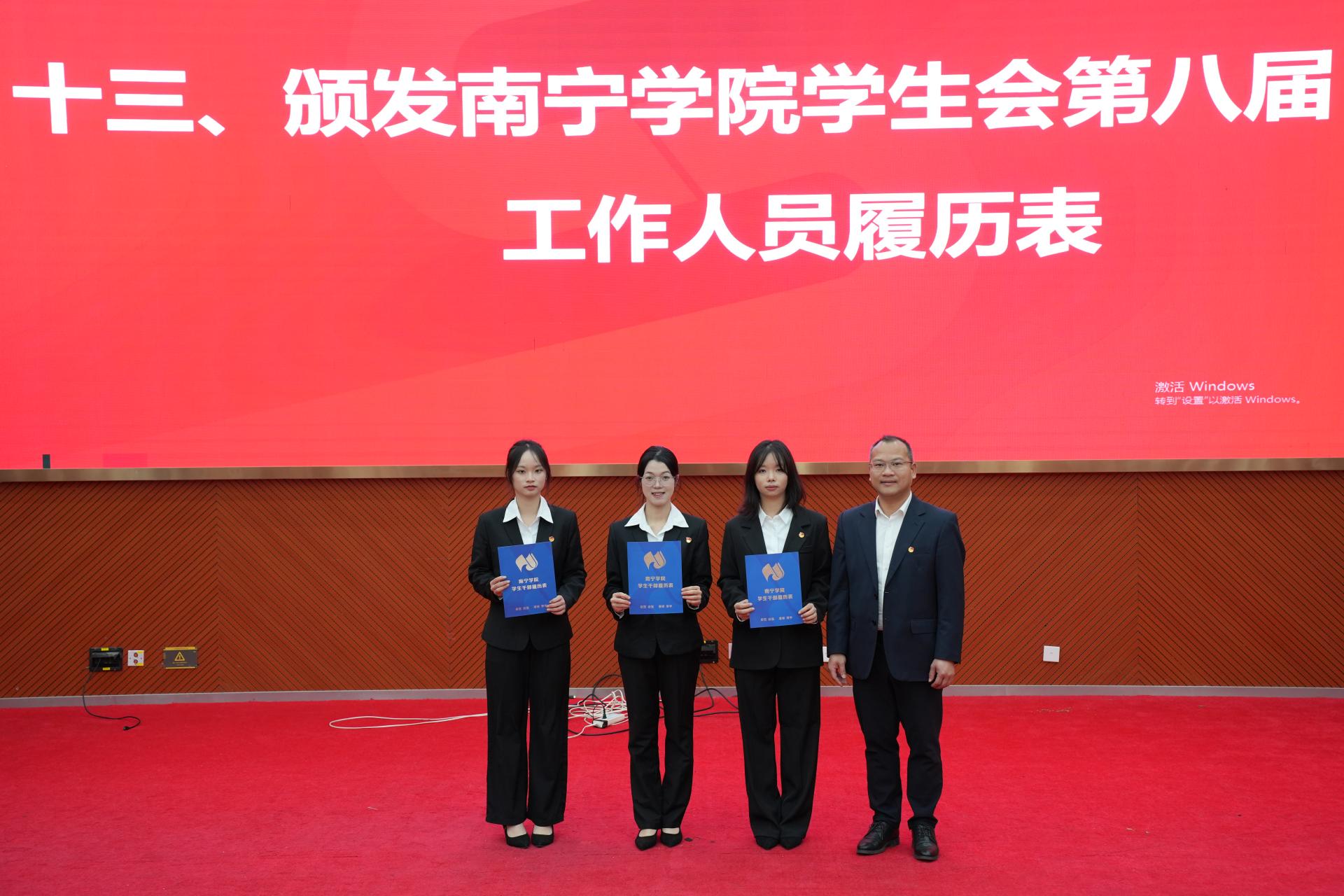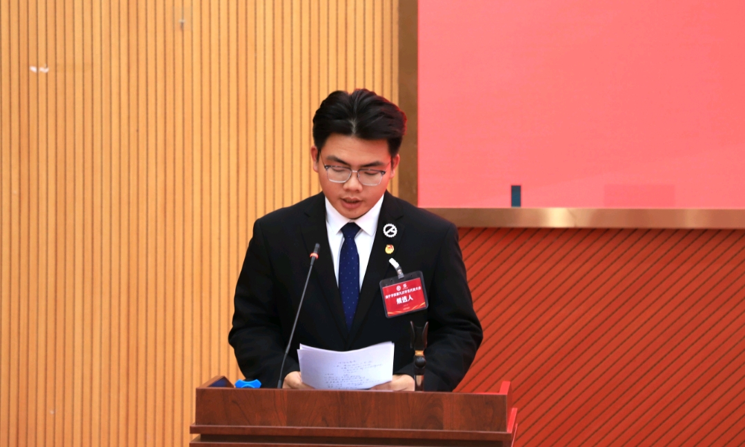 选举结束后,主席团候选人代表莫宇扬同学宣读大会倡议书。会上,邓斌书记、郑翔元老师还分别为第八届学生委员会委员颁发了学生干部履历表。