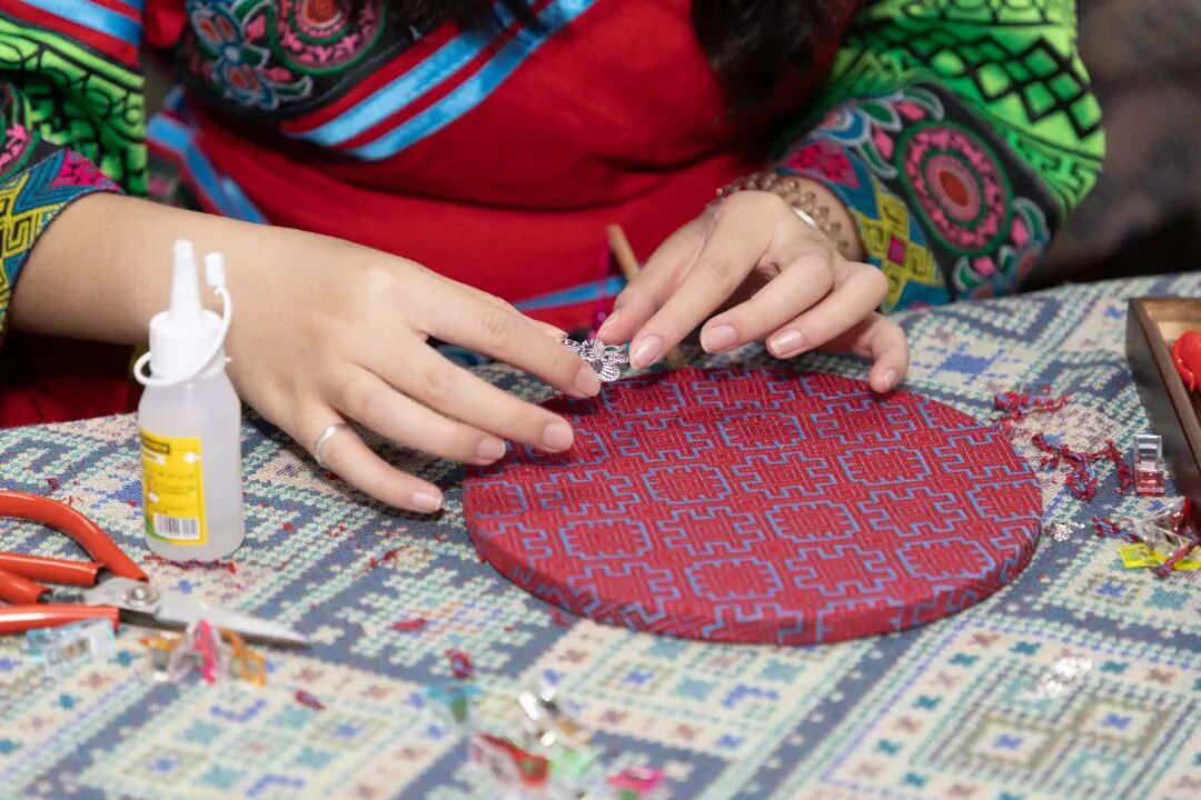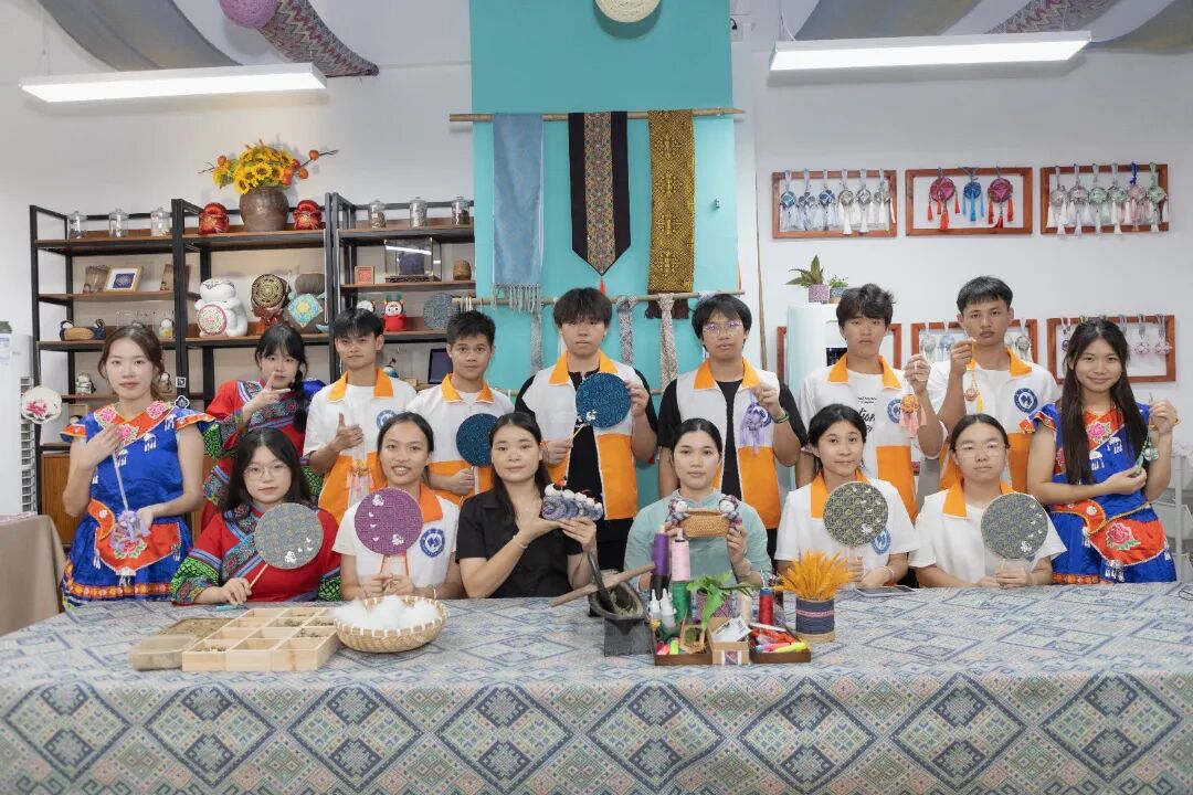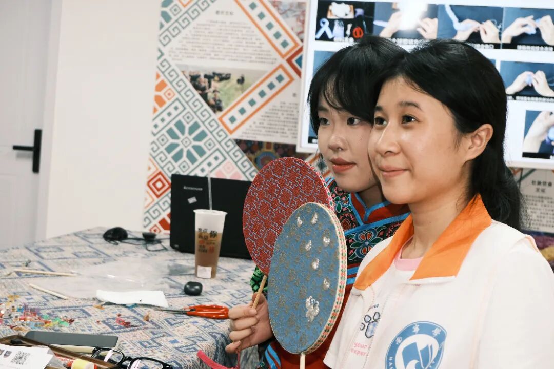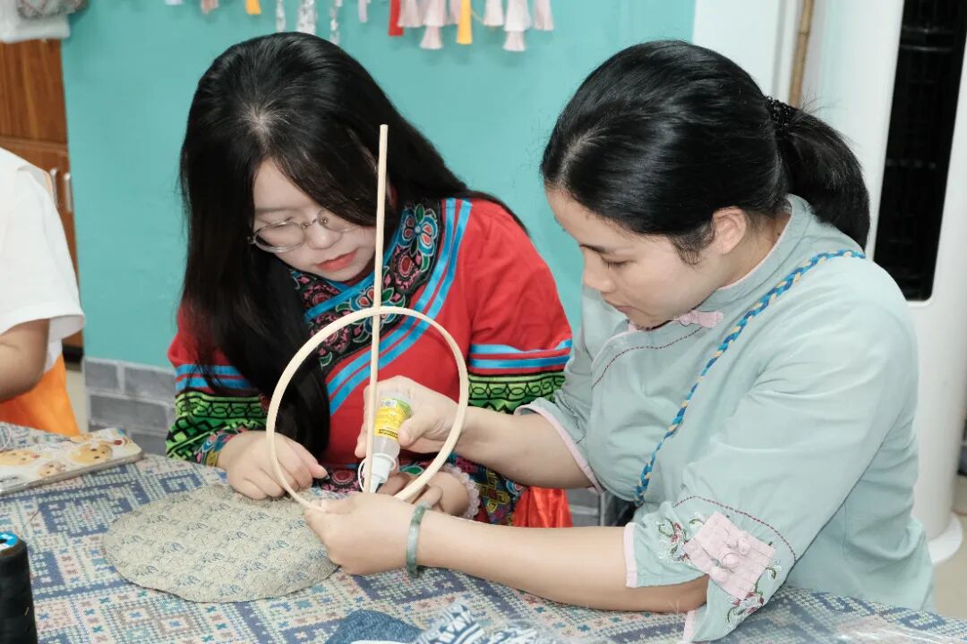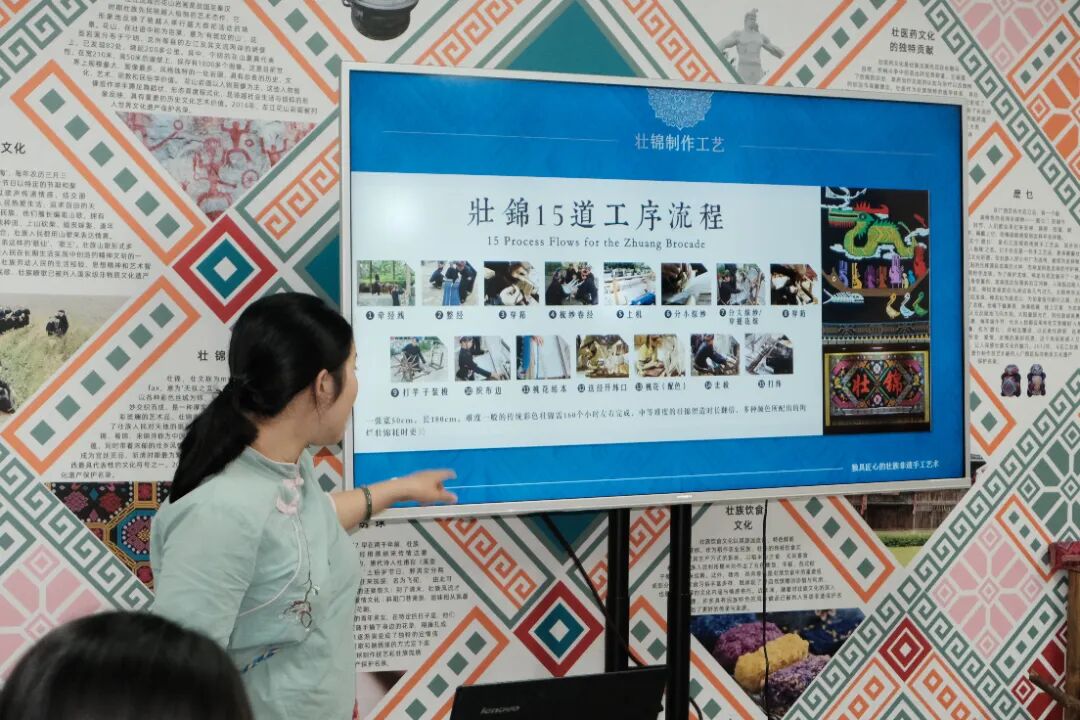 团队抵达体验中心后,为提升整体的体验感更好的系统性学习壮族文化,部分成员穿上传统服饰并且邀请专业的非遗老师进行PPT授课。此刻上午扮演授课角色的成员们纷纷变成认真听课学习的学生。团队分别学习了团扇和绣球的制作以此更好的感受壮族工艺的魅力。